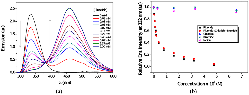 - Lee, J.Y.; Cho, E.J.; Mukamel, S.; Nam, K.C. Efficient fluoride-selective fluorescent host: Experiment and theory. J. Org. Chem. 2004, 69, 943–950. [Google Scholar] [CrossRef] [PubMed]