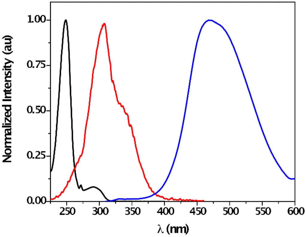 Normalized absorption band of 1 (black line, left), excitation (red line, centered, λem = 468 nm) and emission (blue line, right, λexc = 320 nm) spectra of a mixture of 1 (c = 0.04 mM) and F¯ (c = 2 mM) in acetonitrile under aerobic conditions.