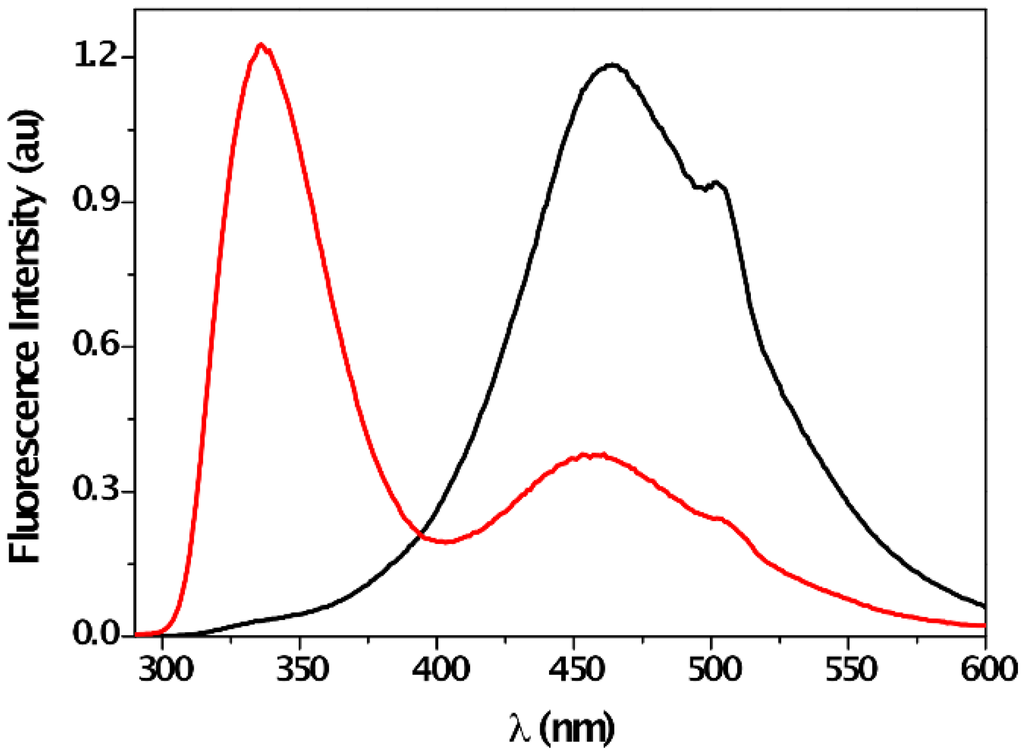 Emission spectra (λexc = 320 nm) of a mixture of 1 (c = 0.04 mM) and F¯ (c = 2 mM) in acetonitrile in the absence (black line, right) and in the presence of 10% methanol (red line, left).