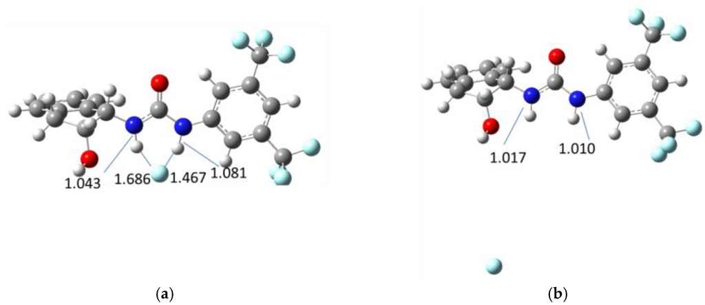 - Liu, W.; Wang, B.; Zhang, C.; Yin, X.; Zhang, J. Theoretical study on a chemosensor for fluoride anion-based on a urea derivative. Int. J. Quantum Chem. 2014, 114, 138–144. [Google Scholar] [CrossRef]