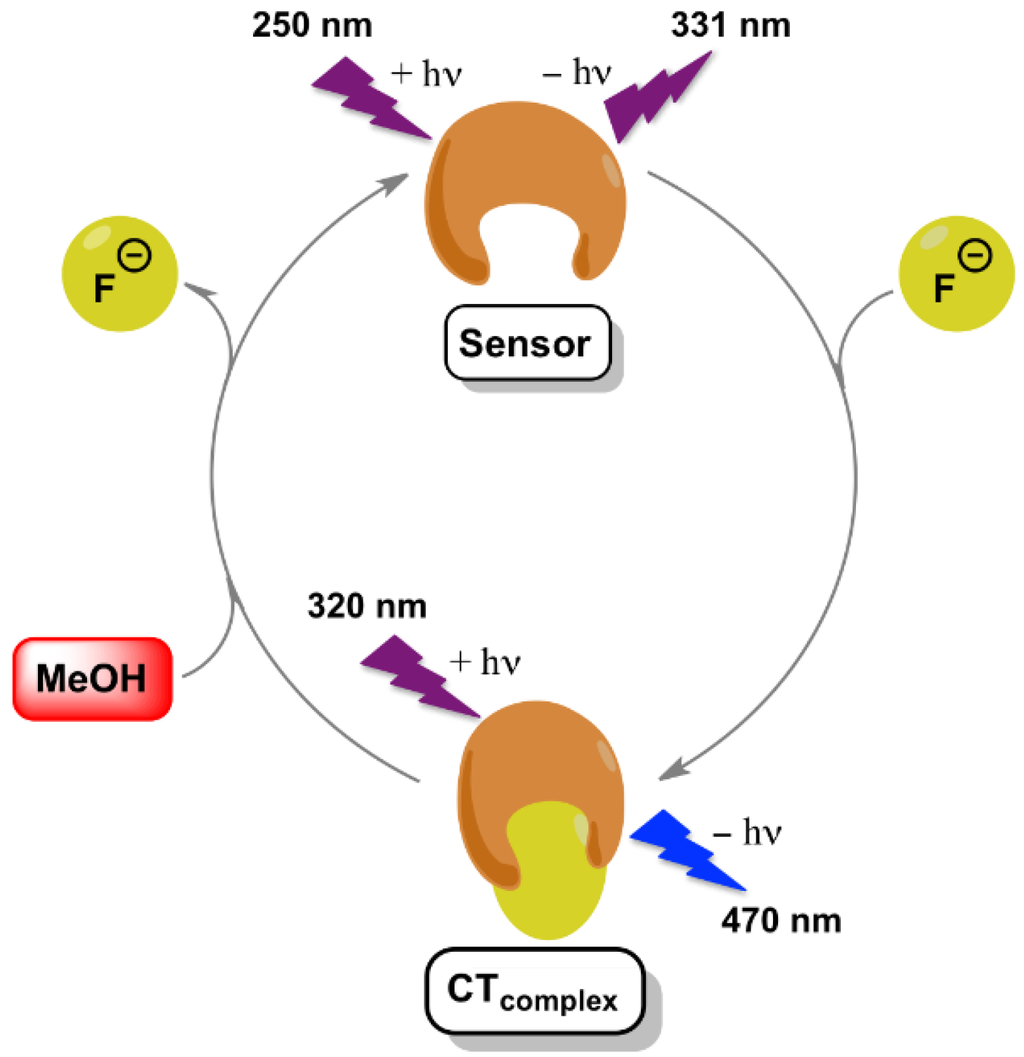 In summary, urea 1 was found to selectively recognize fluoride anion among other halides as demonstrated by means of absorption as well as fluorescence spectroscopic data. The signaling mechanism relies on the formation of a CT complex between sensor 1 and F¯ in the ground state (Figure 8). In this sense, upon recognition of the anion, new absorption and fluorescence bands of this CT complex at longer wavelengths were clearly detected together with a high association constant. The nature of the H-bonding interaction between 1 and fluoride was unambiguously proven by 1H-NMR studies and theoretical calculations. Finally, the recovery of the sensor was achieved using protic solvents such as methanol.