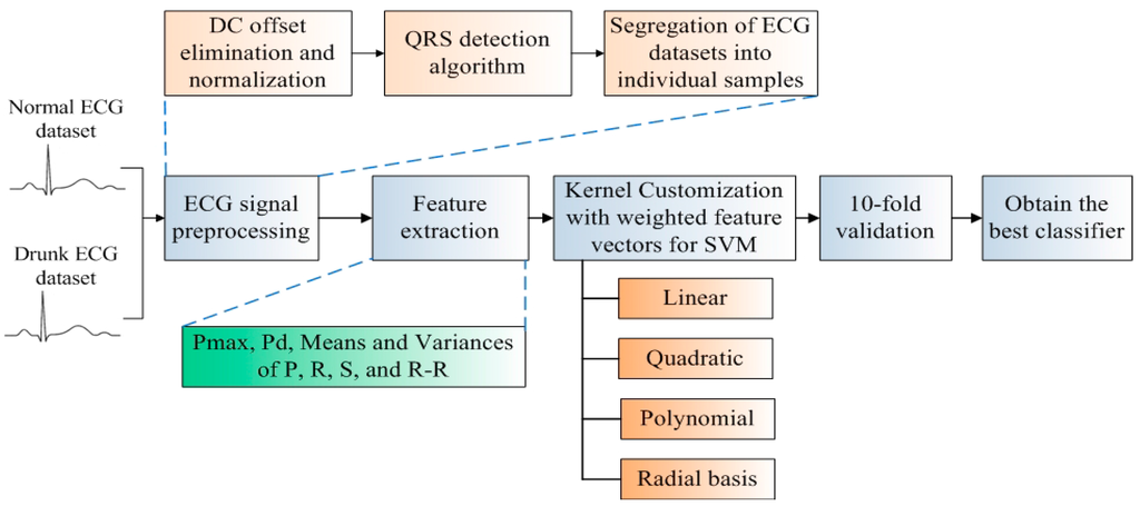 The classifier development flow of ECG-DDD is illustrated in Figure 1. Firstly, two datasets, the normal ECG signals and drunk ECG signals are collected from 50 volunteers for the development of the ECG-DDD classifier. ECG preprocessing is then applied for noise suppression and ECG signal segregation. An ECG signal is segregated into a number of samples and each sample represents the heart activity within one heartbeat. To identify indicative characteristics of “drunk”, key features including Pmax, Pd, means and variances of P, R, S waves and R-R intervals are extracted. The key feature developed in this investigation is that the feature vectors will be weighted to incorporate the important features during the kernel customization. The weighted features are then evaluated and analyzed in four commonly used kernel functions (linear, quadratic, polynomial and radial basis) for the development of classifiers. Hence, there are in total eight different kernel-based classifiers. To train the classifiers for performance evaluation, a well-known and convincing 10-fold cross validation is conducted [13]. The overall accuracy, sensitivity and specificity are evaluated and analyzed at each fold. Finally, the best classifier with the highest accuracy is selected.