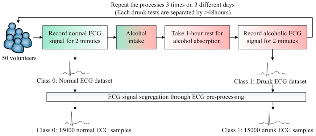 For each volunteer, the normal ECG signal was recorded for 2 min. The relationship between the amount of alcohol intake and blood alcohol concentration (BAC) is related to several parameters. The Widmark formula is widely adopted to estimate BAC [14]. As such, the required amounts of alcohol intakes of all volunteers were estimated by the Widmark formula in order to reach BAC > 0.02% (0.02% BAC is the maximum legal levels of driving in China and Sweden [4]), the volunteer drank the estimated amount of alcohol and took a rest for 1 h. The 1-h rest facilitated the alcohol to be absorbed into human’s bloodstream [15]. After “BAC > 0.02%” is reached and confirmed by a breath alcohol analyzer, the drunk ECG signal was recorded for 2 min. This data collection was repeated 3 times. To suppress the effect of remaining alcohol in the bloodstream, the data collection was conducted on 3 different days. Each drunk test is separated by >48 h.