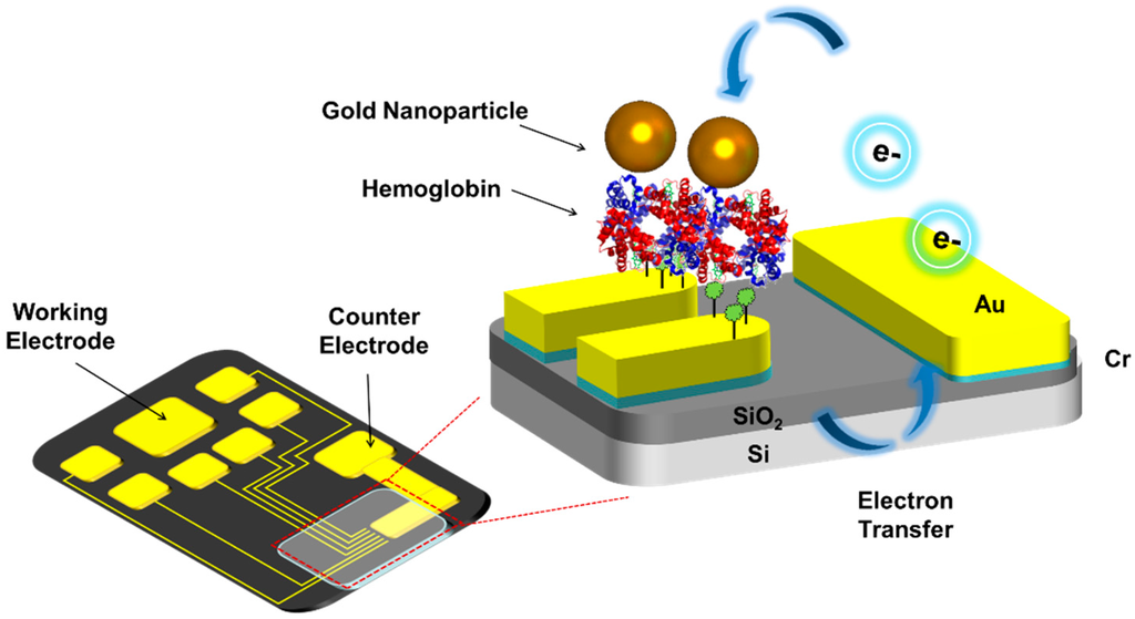 Several groups have studied the hemoglobin-based biosensor on a conventional electrode surface [,,,,,], while others introduced nanoparticles [], graphene [] and other heavy metal materials [] on an electrode to facilitate the electron transfer between H2O2 and hemoglobin. However, such heavy metal-based nanomaterials are toxic and possess low biocompatibility. A gold nanoparticle was introduced to facilitate the electron transfer between hemoglobin and Au electrode. The gold nanoparticle is toxic at low levels and widely used to fabricate the electrochemical biosensor [,]. Furthermore, the electrochemical-based biosensor has been studied on a bulk scale electrode. Some groups proposed miniaturized biosensor to detect the ErbB2 protein [], PSA [] and DNA hybridization []. Those miniaturized biosensors provide (1) defined distance between working and counter electrodes; (2) detect the low concentration of sample. To develop the advanced electrochemical biosensor based on direct electron transfer, the miniaturized biosensor with high sensitivity will be needed.