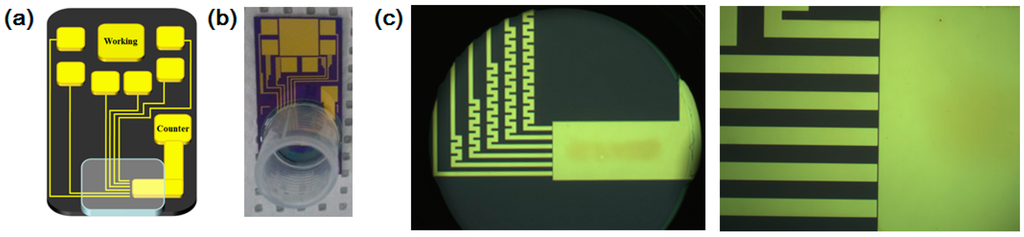 (a) Schematic diagram of micro-gap electrode; (b) Optical image of fabricated micro-gap electrode with working chamber for H2O2 biosensor application; (c) Optical image of zoomed micro-gap.