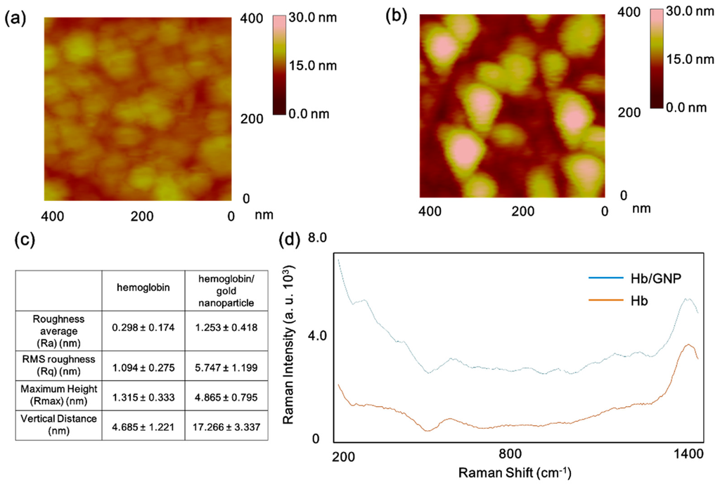 Surface morphology investigation of (a) hemoglobin; (b) hemoglobin/gold nanoparticle on 6-mercaptohexanoic acid (6-MHA) layer; (c) Surface roughness analysis of the hemoglobin, hemoglobin/gold nanoparticle; (d) Raman spectra of hemoglobin (Brown line); (b) hemoglobin/gold nanoparticle on 6-MHA layer (Blue line).