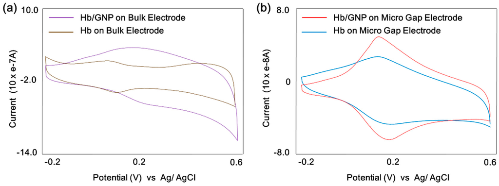 A cyclic voltammetry was conducted to compare the redox properties of the Hb and Hb/GNP heterolayer-immobilized on a conventional Au electrode (1 × 2 cm) and Au micro-gap electrode. As shown in Figure 4a, the redox property of the Hb showed a quasi-reversible redox peaks (Brown line) because of the Fe3+/2+ redox center that provides the electron exchange. The anodic peak potential (Epa) and cathodic peak potential (Epc) were showed at 103 mV and 67 mV (vs. Ag/AgCl), respectively, with a peak-to-peak separation (ΔEp) of 36 mV. The redox property of the Hb/GNP showed a signal-enhanced redox peak (Purple line) because the GNP facilitates electron transfer between Hb and H2O2. The anodic peak potential (Epa) and cathodic peak potential (Epc) were 233 and 181 mV (vs. Ag/AgCl), respectively, with a peak-to-peak separation (ΔEp) of 52 mV. This result shows that the gold nanoparticles provide the higher surface roughness and active area which yields to a higher coverage [].