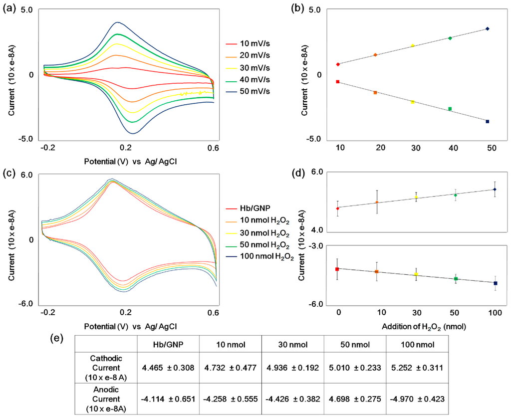 (a) Cyclic voltammogram of hemoglobin/gold nanoparticle (Blue line) immobilized on Au micro-gap electrode in 10 mM PBS (pH = 7.4) at different scan rate (mV/s) (Red line: 10 mV/s, Orange line: 20 mV/s, Yellow line: 30 mV/s, Green line: 40 mV/s, Blue line: 50 mV/s); (b) Plots of anodic and cathodic peaks currents vs. scan rates; (c) Cyclic voltammogram of hemoglobin/gold nanoparticle (Blue line) immobilized on Au micro-gap electrode containing (Red line: 0, Orange line: 10 nmol, Yellow line: 30 nmol, Green line: 50 nmol, Blue line: 100 nmol H2O2 at 50 mV/s); (d) Plots of anodic and cathodic peaks currents vs. addition of H2O2; (e) Table of current values corresponding to H2O2 concetrations.