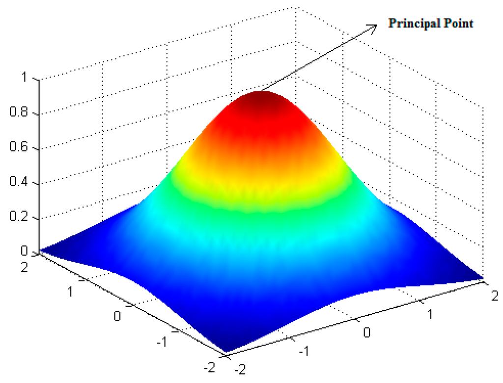 To develop the algorithm for image fusion in the overlap region of the matched UAV images, some parameters should be defined first, in which the principle points of the two matched images were O1 and O2; O is an arbitrary point in the overlap region; d1(|O − O1|) and d2(|O − O2|) are the distances between O1, O2 and O; The pixel values of point O in the two matched UAV images are and . The pixel value of point O after image fusion is Iij. Therefore, Iij can be defined as , where w1, w2 are the weight contributions of the two UAV images to point O, and w1 plus w2 is equal to 1. Based on the theory mentioned above, a Gaussian kernel shown in Figure 1 was introduced to describe the Gaussian distance weight distribution (Gw1), and was defined by Equation (1):