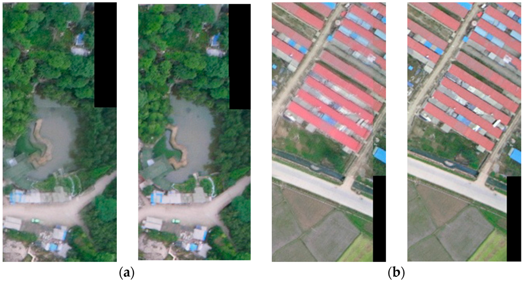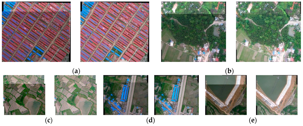 The results of Wallis dodging for two matched UAV images of each type land use, in which (a)–(e) correspond to buildings, woodland, farmland, road, and water, respectively. For example, in the case of (a), the left figure was the direct stacking result of two matched images, whereas the right figure was the stacking result of two matched images after Willis dodging.