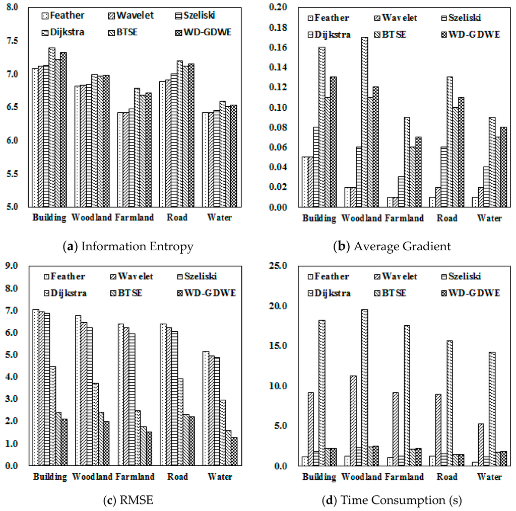 To acquire the optimal adjustment coefficient (λ) for the WD-GDWE method, a series of values from zero to five with a step size of 0.2 were set, based on which the optimal value of λ was determined when the lowest RMSE between the test images and reference images was achieved. In this study, the optimal value of λ was set to 2.6. Lastly, performance comparisons between WD-GDWE and five other classical seamline elimination algorithms were conducted in terms of efficiency and effectiveness. The specific five classical methods are: Tian’s BTSE algorithm, Uyttendael’s feathering algorithm, Su’s Wavelet algorithm, Szeliski’s algorithm, and Davis’s Dijkstra algorithm, in which the first four methods are based on image fusion and the last one is based on seamline detection. Generally, the image quality assessment indicators for seamline elimination can be divided to three types [39,40,41,42,43]: (1) amount of information: information entropy, standard deviation, cross entropy, signal to noise ratio, and joint entropy [44,45]; (2) image quality: average gradient and wavelet energy ratio [46]; (3) spectral information reserved: RMSE, standard deviation, deviation, and spectral distortion; Taking all three types of indicators into consideration, information entropy, average gradient, and RMSE were selected to access the specific five methods of seamline elimination, respectively. In addition, processing time is also an indicator for evaluating the efficiency of the algorithm. It should be noted that orthoimages were severed as reference images of the RMSE, which was produced from the control points recorded by artificial with the help of a differential GPS.