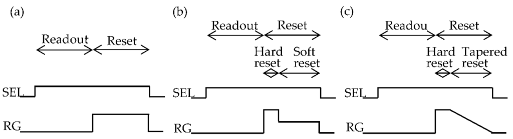 Timing diagram for one pixel. (a) Hard reset and soft reset; (b) Flush reset; and (c) Tapered reset.