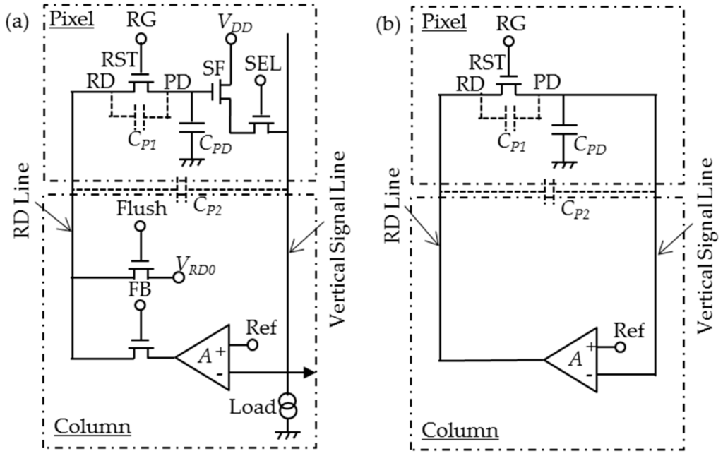 Figure 3a shows a schematic diagram of the pixel and the related column-based feedback circuits for the FRRT to be analyzed in this section. The feedback is applied through the RD. The pixel structure is the same as the conventional 3-Tr scheme, as shown in Figure 1. The exception is that the RD wiring is prepared separately from the SF drain line. Other feedback circuits and ramp circuits are column-based. The vertical signal line, transferring the SF output voltage, is connected to the negative input of a column-based differential amplifier together with the load transistor and the following signal circuits. The positive input is connected with a ramp generator, . The output of the amplifier is connected to the RD through the additional vertical RD line. Both the parasitic capacitance between PD and RD, CP1, and the parasitic capacitance between the vertical signal line and the RD line, CP2, are included in the analysis. It is assumed that CPD does not include CP1. The timing chart for this structure is shown in Figure 4. After one row is selected by SEL, signal is read out in a fashion similar to the one of the conventional 3-Tr scheme at first. During the reset period, a hard reset is carried out in front to eliminate vestiges of previous signals, by setting Flush to ON. Subsequently, FRRT is executed turning FB ON and gradually decreasing .