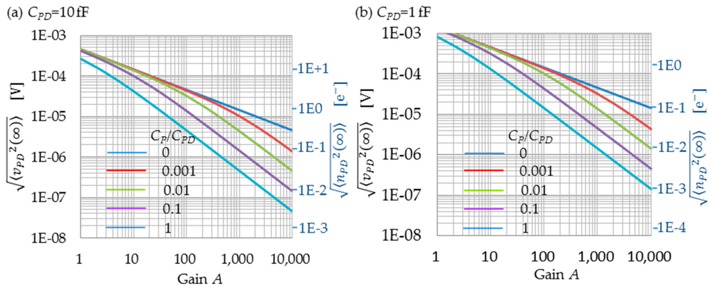 When , the limit of the noise variance is 1/A times smaller than the soft reset noise variance, , according to Equation (48). The reset noise is therefore much reduced. When , becomes even smaller than that when , because CP couples the output of the amplifier to the PD directly, which contributes as a capacitive feedback [21], in addition to the feedback path through the RST. However, large values of CP have some drawbacks as well; if the vertical signal line capacitance and the RD line capacitance are large, the feedback speed is limited. If CP1 is large, the conversion gain is decreased. Figure 5a,b show the reset noises for CPD = 10 fF and 1 fF, respectively. The horizontal axis denotes the amplifier gain A, the left vertical axis represents the reset noise voltage , and the right vertical axis represents the reset noise in number of electrons, . The parameter for the curves is . Here, CP1 = 0 fF is assumed for simplicity. According to this simple model, the reset noise decreases as when = 0. When ≠ 0, the reset noise decreases also as for large values of A. It should be noted that even small values of will drastically decrease the reset noise when A is larger. For example, when , the reset noise is decreased to 30% at A = 1000. If CPD + CP1 is smaller, reset noise in number of electrons becomes smaller while the reset noise in voltage becomes larger. It is important to reduce the detection capacitance, CPD + CP1, as is also the case with the 4-Tr. scheme.