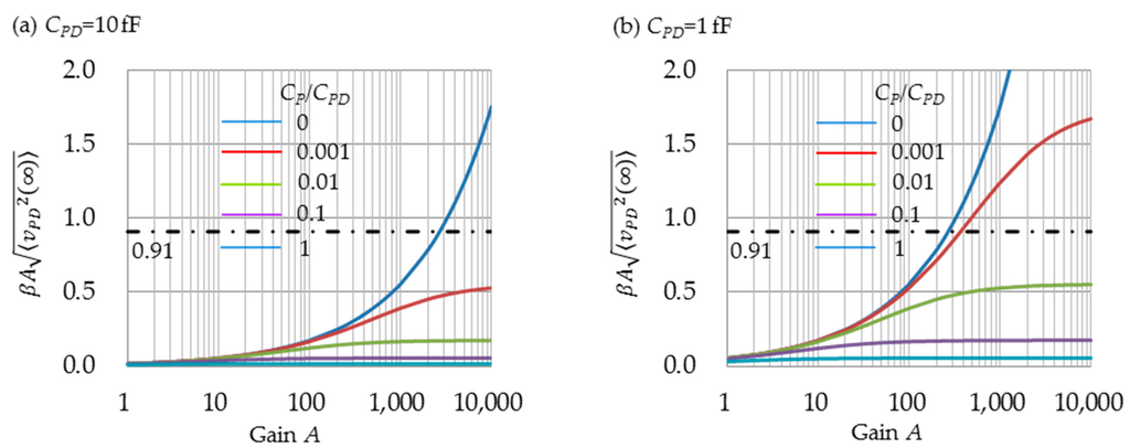 which is always larger than 1. This means that should be smaller than 0.91. Figure 7a,b shows the exponent , substituting to and using . When , the upper limit of A is obtained as 2,700 for CPD = 10 fF and as 270 for CPD = 1 fF, respectively. When , and because Equation (50) < Equation (48), the range within which approximation Equation (43) can be used becomes larger. For example, when , the upper limit becomes more than 10,000 for both CPD = 10 fF and CPD = 1 fF.