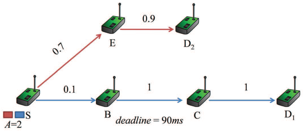 The number associated with each link is the probability for a packet being successfully delivered to the next node through the link, denoted by , which means that on average, transmission trials are needed to successfully deliver a packet through the link. The integer variable A denotes the number of packets in the buffer waiting to be served. The delivery path for the first packet is , and the path for the second packet is . We assume that one transmission takes 10 ms, and the deadline of delivering the first packet from node S to node is 90 ms. For delivering the packet to node before the deadline, the summation of transmission trials along the path must be no more than nine, that is the result of 90 ms divided by one transmission time of 10 ms. Traditional protocols set the same retransmission threshold for each relay node in advance. If the protocol is set by a high retransmission threshold, such as 29, in the CTPprotocol [], without the consideration of delay requirement, thus the probability for successfully transmitting the first packet through the link can be significantly improved. However, this strategy may make the deadlines of both packets expire and consumes more system resource. If the maximum number of transmission trials is three for each node, in view of the summation of transmission trials, there are no more than nine. Then, the probability of the first packet passing the link is . However, if the retransmission thresholds of the three nodes are set to 6, 0 and 0, that is the maximum numbers of transmission trials are 7, 1 and 1, then the probability is . In terms of latency and reliability, there is a tradeoff in determining the retransmission threshold. Therefore, the retransmission threshold should be carefully chosen to achieve desirable QoS provisioning [].
