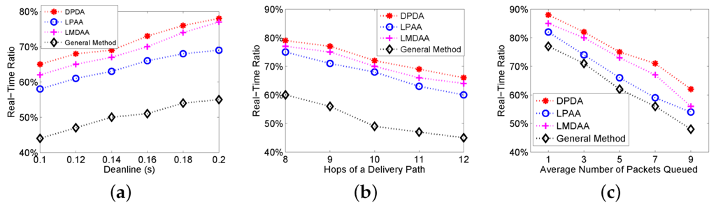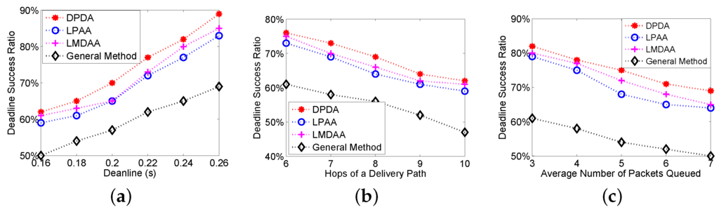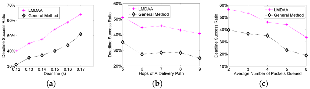 The first group of experiments is to investigate the Deadline Success Ratio (DSR) of the proposed algorithms, where DSR is the ratio of the packets delivered to the destination before their deadlines. Figure 3a shows the relationship between the deadlines and DSRs. The proposed algorithms have better performance. For example, when the deadline is 0.22 s, the DSRs of LMDAA and general method are 74% and 61%, respectively. Furthermore, we investigate the impact of the number of hops of a delivery path on the DSR. The remaining time to the deadline and link quality have been considered; thus, our algorithms can achieve higher deadline success ratios as shown in Figure 3b. Figure 3c depicts the relationship between the average number of packets queued at relay nodes and DSRs. From Figure 3c, the DSR becomes worse with the increase of the packets queued on the condition that the deadline is a constant. LMDAA is a distributed algorithm and enables the node to adaptively set the optimal retransmission threshold based on the link quality and the remaining time to the deadline. Therefore, LMDAA has better performance in terms of DSR than that of LPAA.