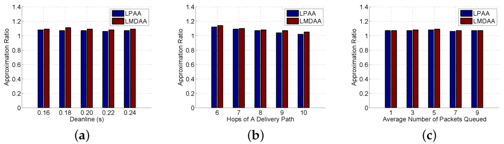 The forth group of experiments is to investigate the computing performance of LPAA and LMDAA, and the correctness of the approximation ratio is verified. We prove that the objective function value of Equation (12) is a lower bound of that of Equation (2), then generated by the optimal solution of Equation (12) is an upper bound of Equation (1). In the experiments, the Approximation Ratio (AR) is the ratio of generated by the optimal solutions of linear programming Equation (13) to that of the approximated solutions output by LPAA and LMDAA. Figure 6a–c demonstrates the relationships between the approximation ratio and the input parameter. Experimental results show that the objective function value of the approximation results returned by LPAA and LMDAA is very close to that of the optimal ones. Additionally, the proposed approximation algorithms can achieve high accuracy in terms of optimal retransmission thresholds.