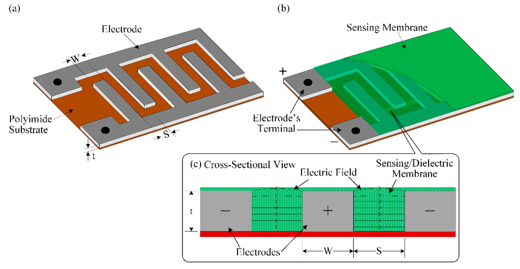 Schematic diagram of the interdigitated electrode: (a) without the dielectric/sensing membrane; (b) dielectric/sensing membrane in the IDE; and (c) cross-sectional view of the IDC.