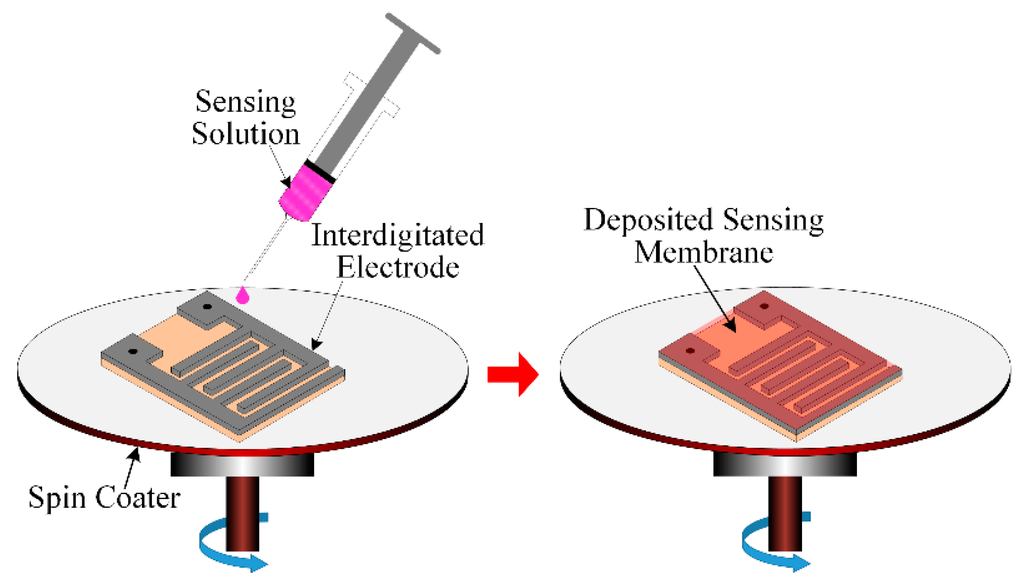 Deposition process of the sensing/dielectric solution into the IDE with a spin coater, to obtain the IDC.