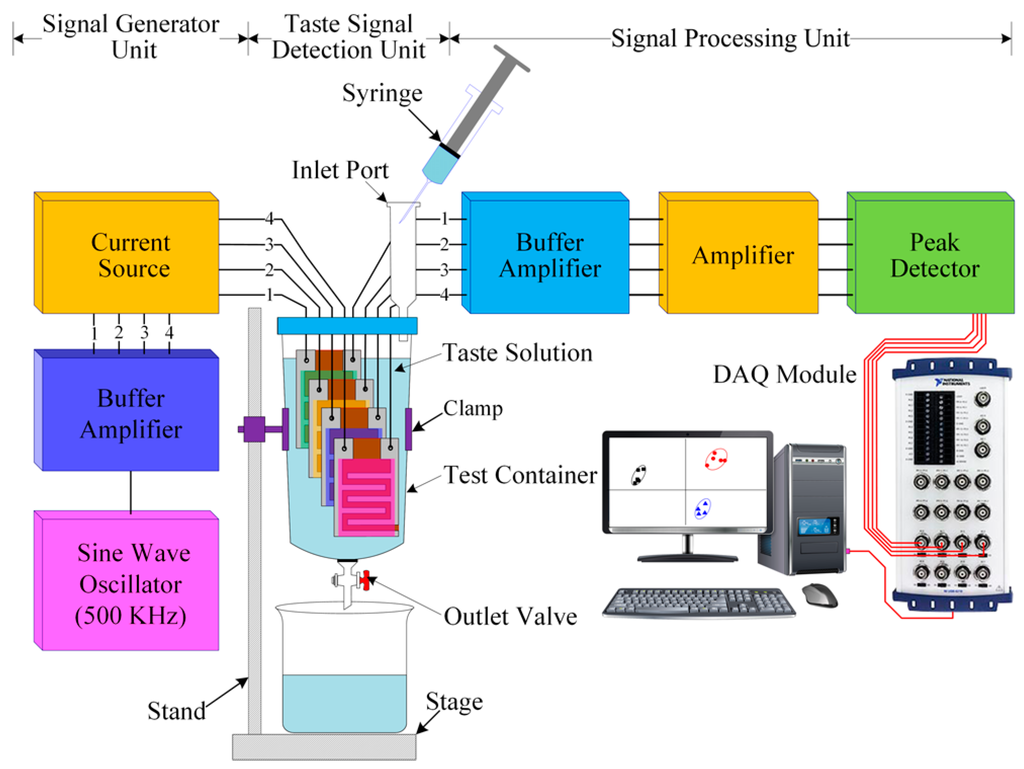 Figure 6 shows a schematic diagram of the designed IDC electronic tongue’s experimental setup. This setup involves three units: a signal generator unit, a taste signal detection unit, and a signal processing unit. The signal generator unit is a 500 kHz sine wave oscillator, whose output is linked to the input of a four channel buffer amplifier (to avoid loading effects). The four outputs of the buffer amplifier are linked to the inputs of four controllable current generators. The taste detection unit consists of four IDC sensing elements and a test chamber made of Teflon, to prevent reactions between the target taste solution and the test chamber. The four inputs of the IDC sensing elements are connected to the outputs of the four current sources.
