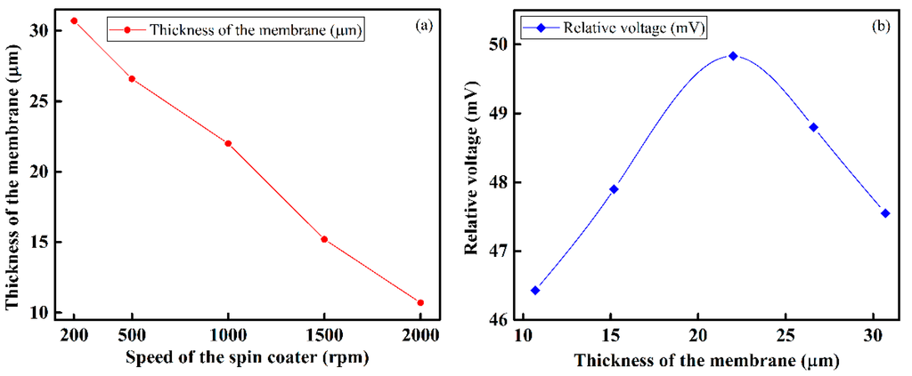 Characteristics of the sensing membrane: (a) relationship between the spin coater speed and the thickness of the IDC dielectric membrane; and (b) relationship between the thickness of the IDC dielectric membrane of the IDC and the obtained relative voltage.