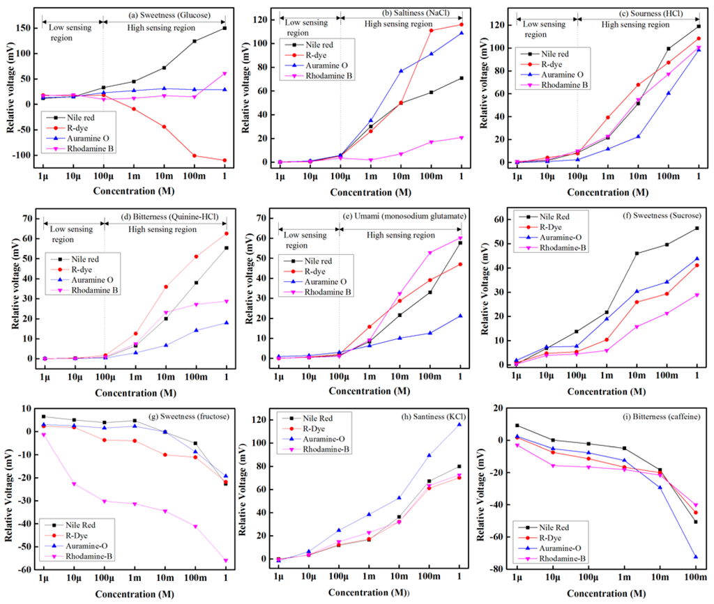The relative voltage of each sensing element is considered to be the response of that specific sensing element of the array. As shown in this figure, the relative voltage rises as the taste solution’s concentration rises. We divided the sensing performance of the array into two regions: the low and high sensing regions. The low sensing region covers concentrations from 1 µM to 100 µM, while the high sensing region covers concentration values of 100 µM to 1 M. As can be seen in Figure 11, every sensing element of the array provided a linear response over its dynamic range. In our study, we obtained that the highest detection performance was consistently achieved with sweetness (glucose solution), while the lowest detection performance was consistently obtained for bitterness (quinine-HCl). The relative voltages of glucose and bitterness at a concentration of 1 M were approximately 150 mV and 18 mV, respectively. We also observe the sensing ability of the proposed electronic tongue under other basic taste solutions, namely: sucrose and fructose for sweet sensation, KCl for salty sensation, and caffeine for bitterness sensation and the results are shown in Figure 11f–i, respectively.