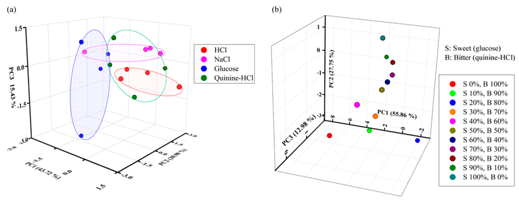 PCA results for the dataset obtained by sensing mixed taste solutions with the designed IDC electronic tongue: (a) mixture of four different taste solutions (HCl, NaCl, glucose, and quinine-HCl) and (b) different percentages of mixed glucose and quinine-HCl solutions.