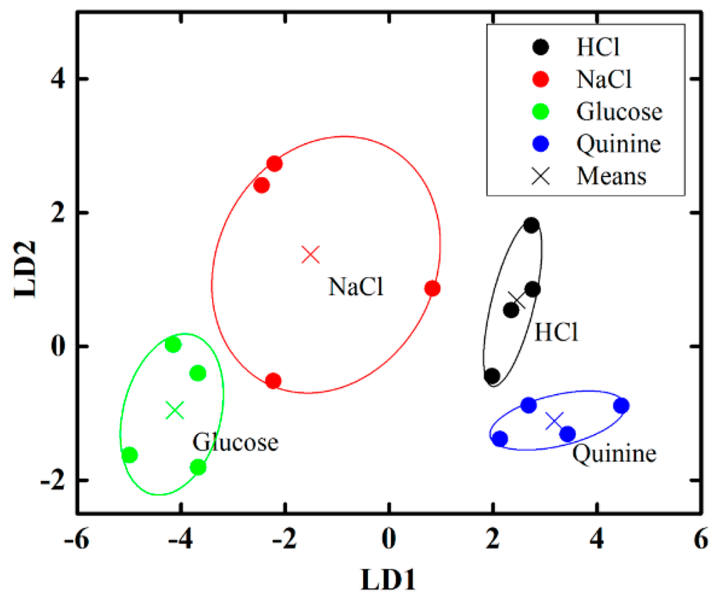 To determine the discrimination performance of the proposed electronic tongue under the mixture of sweet (glucose) and bitter (quinine) compound with different percentages, we applied PCA method and the result is shown in Figure 14b, where it is observed that the electronic tongue can successfully distinguish mixed glucose and quinine solutions of different percentages. In our study, we also have applied the linear discriminant analysis (LDA) method to observe the discrimination performance of the proposed electronic tongue under the mixture of several taste compound such as: HCl, NaCl, glucose, and quinine and the result is shown in Figure 15. According to our analysis we can say that the discrimination performance of the proposed IDC electronic tongue is good and it can differentiate different types of taste from mixtures of different basic taste solutions.