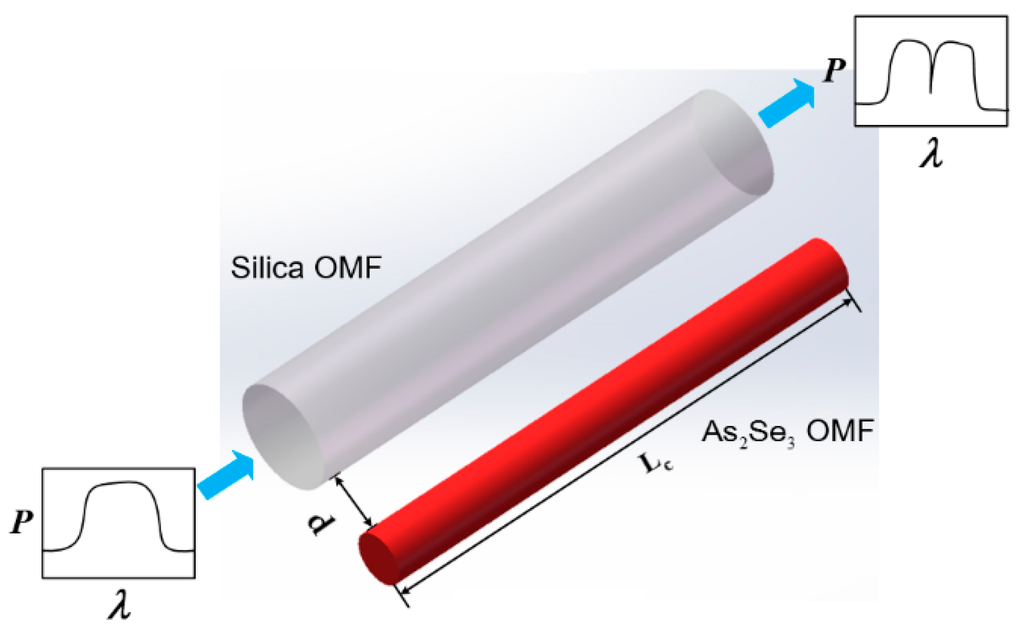 The structure of the sensor component is shown in Figure 1. This sensor component is based on the coupling of asymmetric OMFs, which are composed of silica and As2Se3. R1 and R2 are the radii of the silica and the As2Se3 OMFs, respectively. d is the distance between the surface of the two microfibers. LC is the length of the asymmetric OMF coupler.