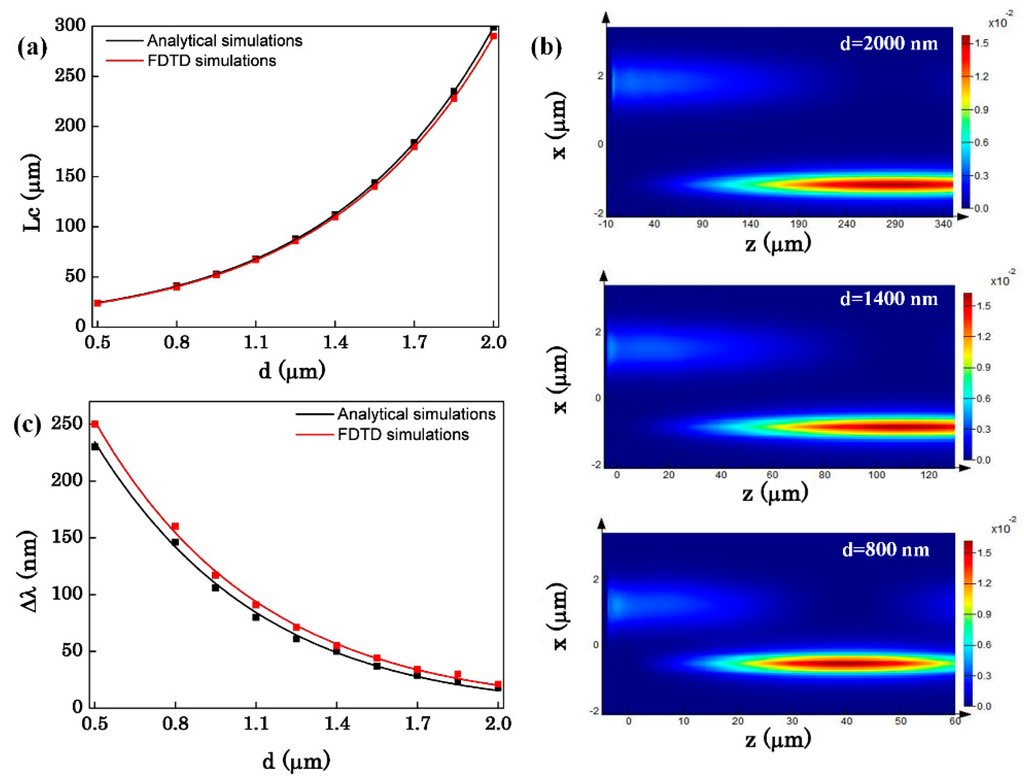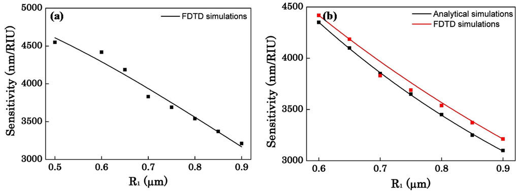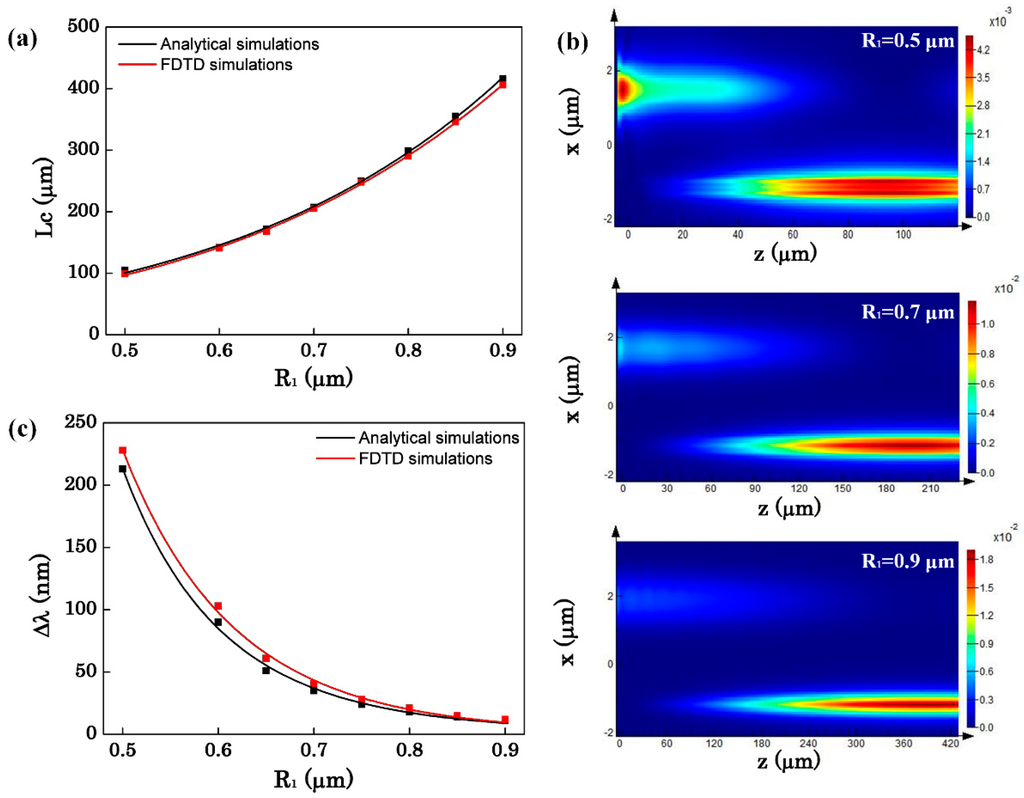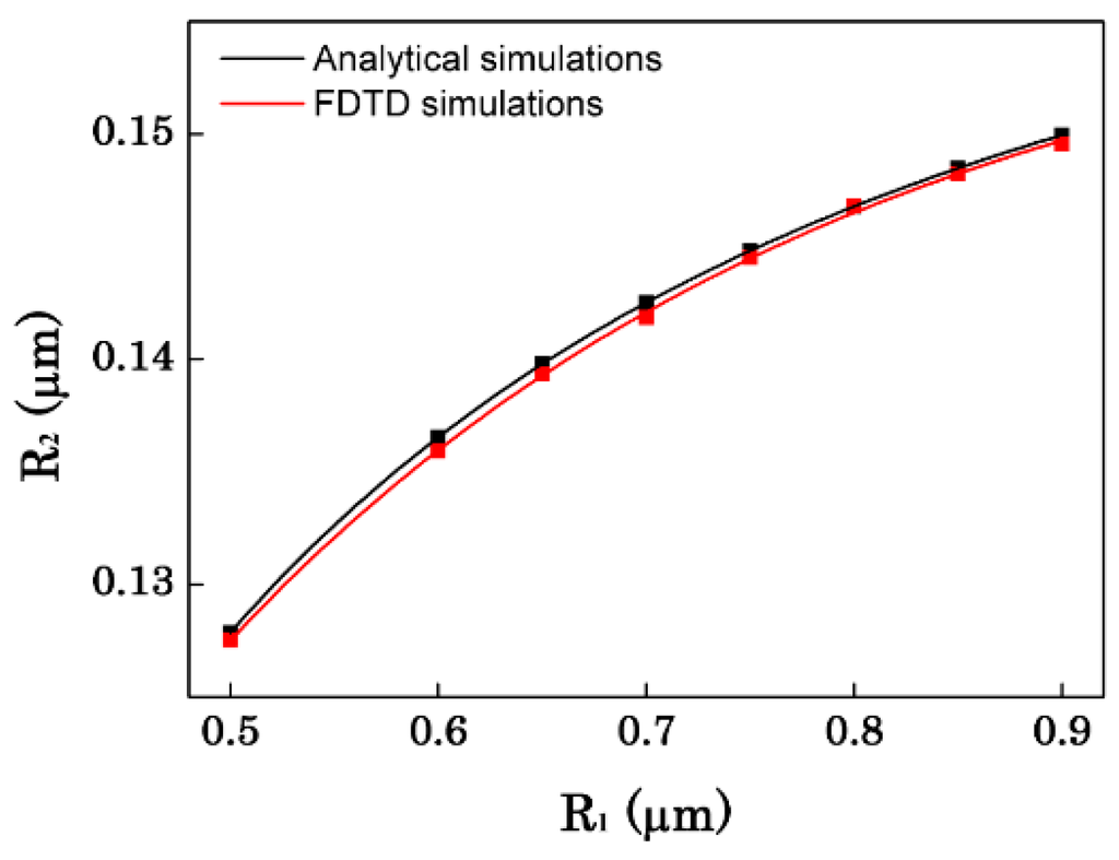 Here, the light propagation in the coupler is simulated by the Lumerical FDTD Solutions software. The following results are obtained by the FDTD simulations. Moreover, in order to demonstrate the accuracy of the FDTD simulations, analytical simulations are also presented in the following results which are obtained by solving Equation (1). Considering the factors influencing the sensor performances, we mainly carry on the analysis and discussion on R1 and d. Because R2 varies with R1, we only discuss the effect of R1 on the sensor performance instead of the two radii. nc is 1.318 in water at 1.55 μm wavelength (25 °C). In order to guarantee the single-mode propagation, R1 varies from 0.5 to 0.9 μm. We change the distance from 500 nm to 2000 nm, while the surrounding aqueous medium nc varies from 1.318 to 1.328. Phase match wavelength is set at 1.55 μm.