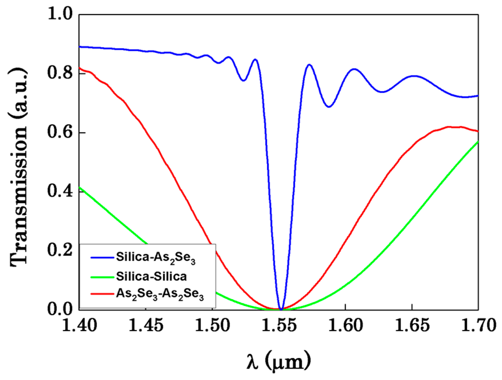 Then, we verify the single-notch and narrowband characteristics of the asymmetric coupler. As can be seen in Figure 4, there is only one resonant dip at the wavelength ranging from 1.4 μm to 1.7 μm. Due to the asymmetry of the two OMFs, they can only reach complete coupling at a certain wavelength (here is 1.55 μm), so there is only one dip at the whole single-mode band. We can also see that, compared with the symmetric coupler, which is composed of both silica OMFs or As2Se3 OMFs, the bandwidth of the asymmetric structure is significantly narrower. That is because of the refractive index difference of the asymmetry structure. Here, we just compare with the symmetric coupler composed of both silica OMFs which has been widely studied. The result shows that the bandwidth of our asymmetric structure is about 21 nm, while the bandwidth of silica-silica structure is about 285 nm. It is over one order of magnitude less than the symmetric silica structure. According to Equation (5), the bandwidth of the transmission spectrum is directly related to the detection limit, the larger compressing of the bandwidth will significantly reduce the detection limit. Meanwhile, the sensitivity of our asymmetric structure is 3539 nm/RIU while the sensitivity of silica-silica structure is 4639 nm/RIU. Because the refractive index of silica is 1.444, the refractive index difference between silica and the ambient medium is smaller which make the evanescent field become larger. The larger the evanescent field is, the higher the sensitivity is. So the result also indicates that compared with the symmetric structure, the detection limit of our asymmetric structure could be over one order of magnitude less while the sensitivity is close.