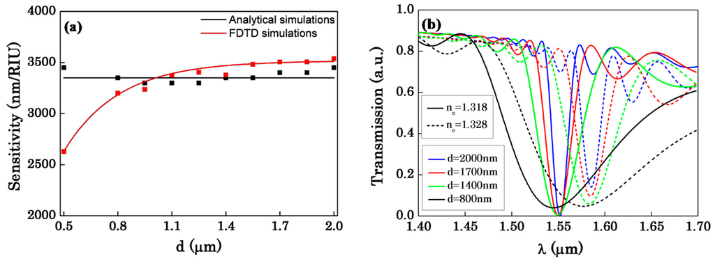 The effect of d to sensor sensitivity is shown in Figure 5. We can see in Figure 5a, when d is approach to 500 nm, there is a large difference between the analytical simulations and the FDTD simulations. Because Equation (1) is applicable in weak coupling conditions, when the two OMFs become closer the coupling of the two OMFs becomes so strong that Equation (1) is not applicable any more. Generally, the FDTD simulations are more accurate. In addition, we can see intuitively that the sensitivity is almost the same as d increases from the analytical simulations, while the sensitivity increases less and less, eventually keeps flat from the FDTD simulations.