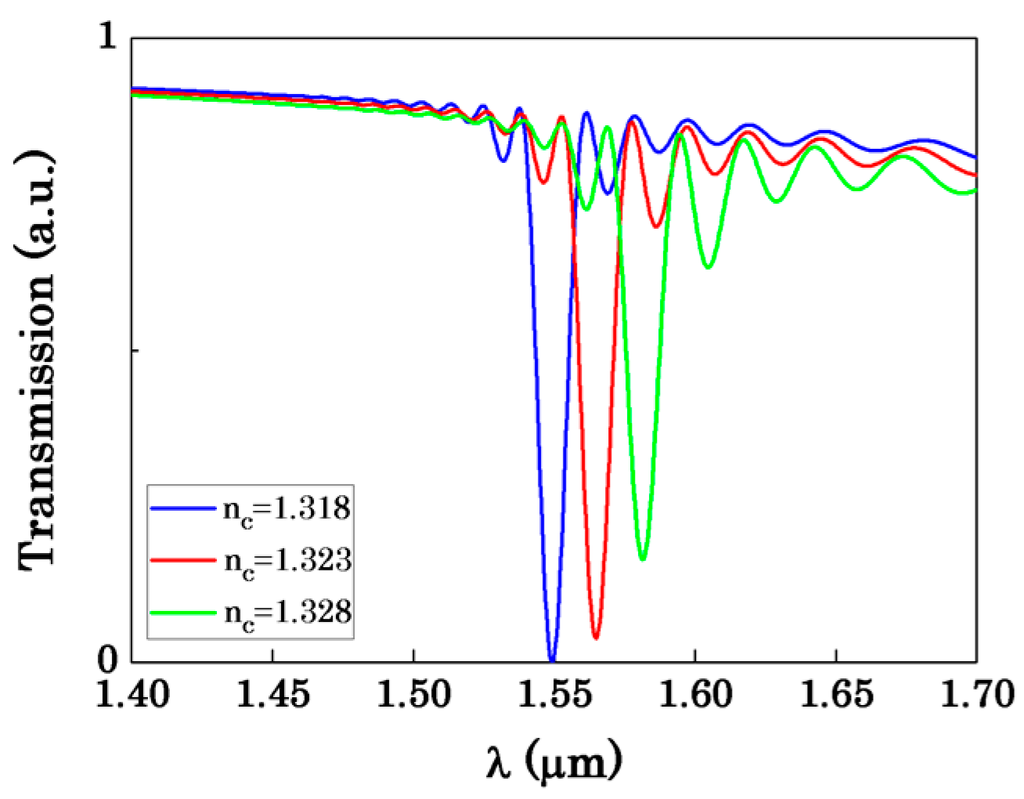 The sensor component is surrounded with an aqueous medium where analyte exists. The variation of the analyte concentration changes the refractive index of the surrounding aqueous medium. Such a variation of the index changes the effective index of the guide mode. Moreover, a shift of the resonant wavelength is induced. The sensitivity of the sensor is defined by [25]