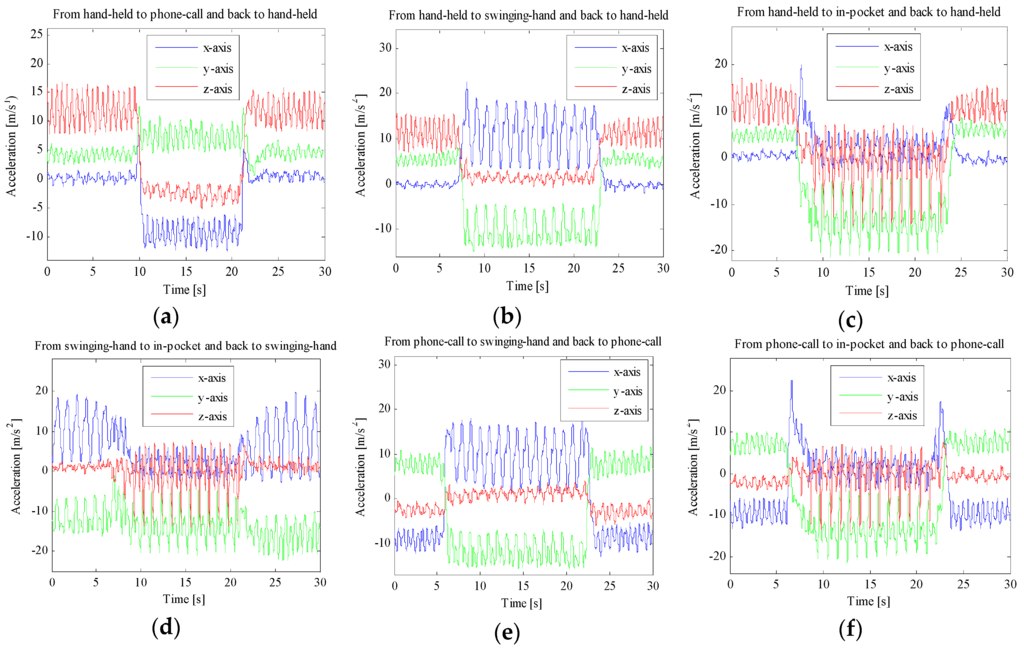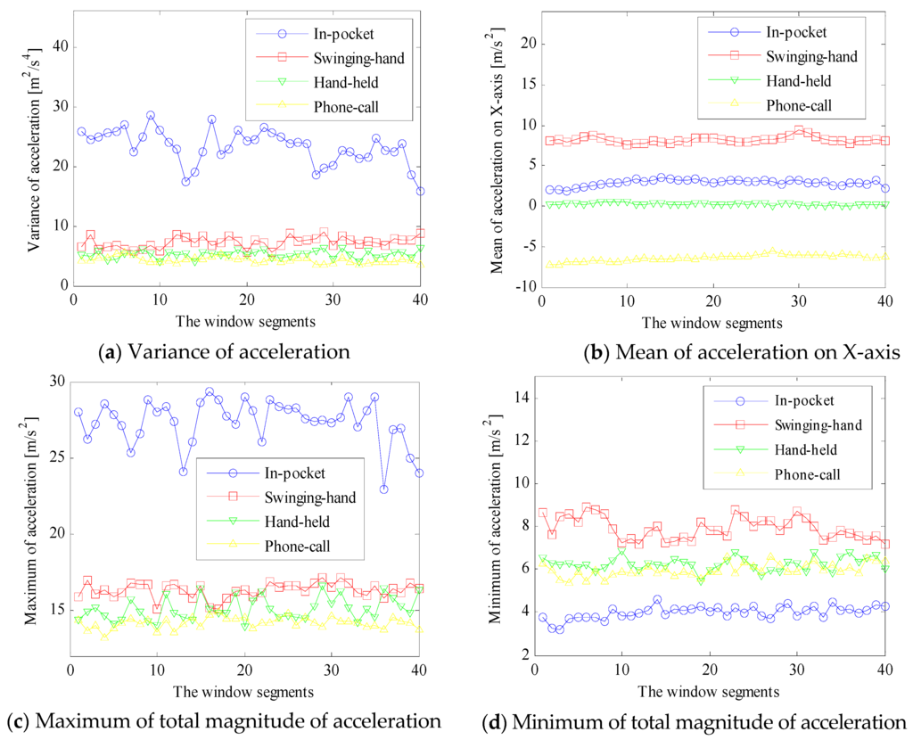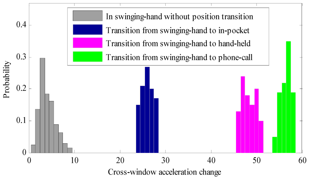 - The cross-window acceleration changes of swinging-hand and in-pocket positions are always larger than those of hand-held and phone-call positions, due to a larger variance of acceleration signals. Thus, we design different thresholds of cross-window acceleration change for different carrying positions.