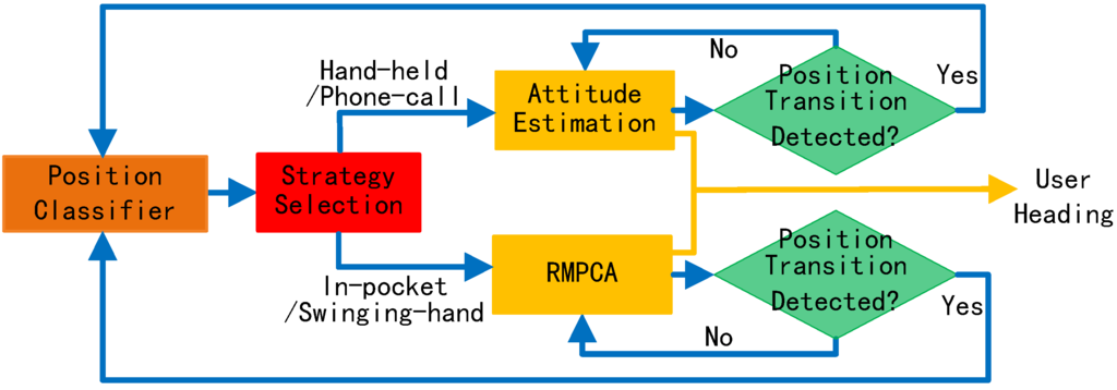 - We propose a novel carrying position transition detection algorithm, which may be used to distinguish between user turns and position transitions, and reduces the computational cost of position recognition.