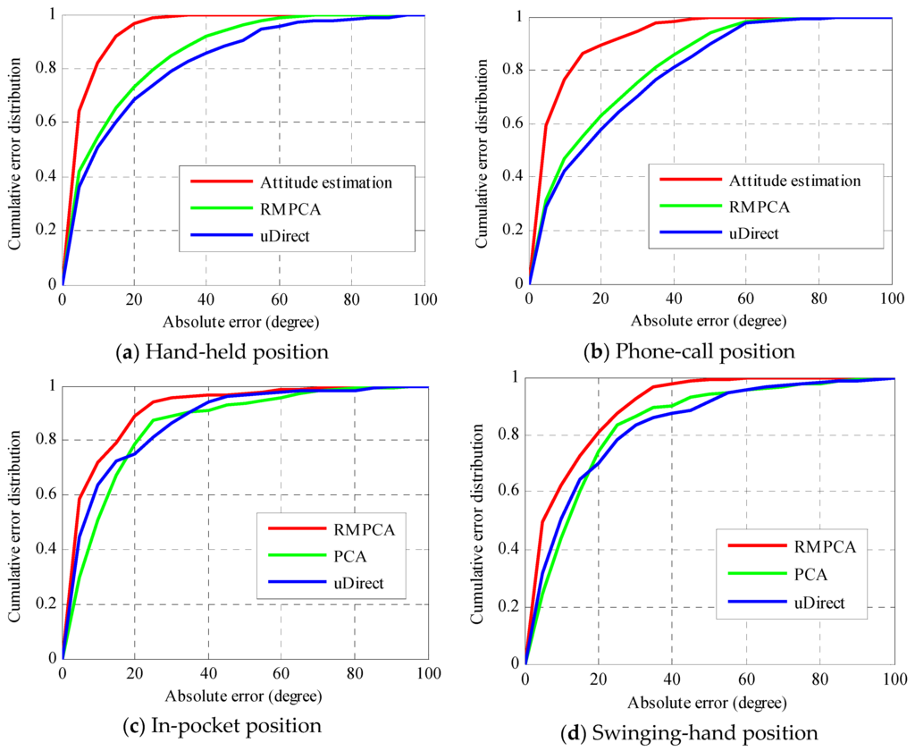 - We further examine the application of PCA-based approaches for the other carrying positions and develop an extended Kalman filter-based attitude estimation model for heading estimation.