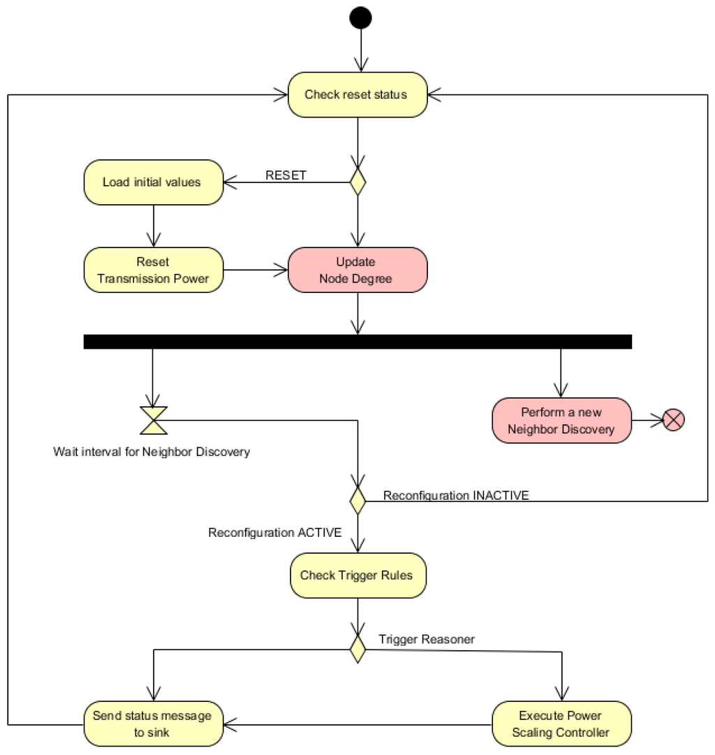 The components PowerScalingMonitor, BatteryLevelObservation and NodeDegreeObservation in Figure 3 shape the monitoring module in Figure 1. The components BatteryLevelObservation and NodeDegreeObservation measure respectively the battery level and the number of neighbors of a node. The component PowerScalingMonitor monitors at a specific rate the number of neighbors and the battery level of a node. With the updated values of the sensed parameters, this component then evaluates the rules discussed previously and, if required, triggers the reasoner represented by the PowerScalingController component. The activity diagram for this component is illustrated in Figure 4.