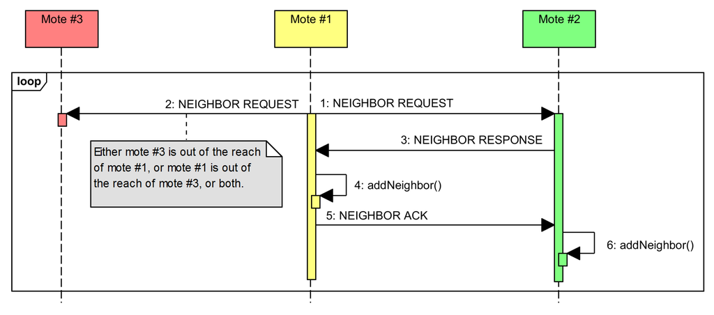 The accomplished neighbor discovery protocol is an active three-way one, as shown in Figure 6. The node that wants to update its neighbor list starts the handshake by broadcasting a NEIGHBOR REQUEST message. The nodes that receive the message issue a unicast NEIGHBOR RESPONSE message. Upon receiving this message, the originating node knows that it is able to reach the responding one and receive the messages, so it can be considered as a neighbor and, thus, added to the list. It then also issues a unicast NEIGHBOR ACK message to acknowledge the other node as a neighbor. At this point, the second node knows that it has been able to reach the originating one, as well as getting its messages. Therefore, it can also be added to its own neighbor list.