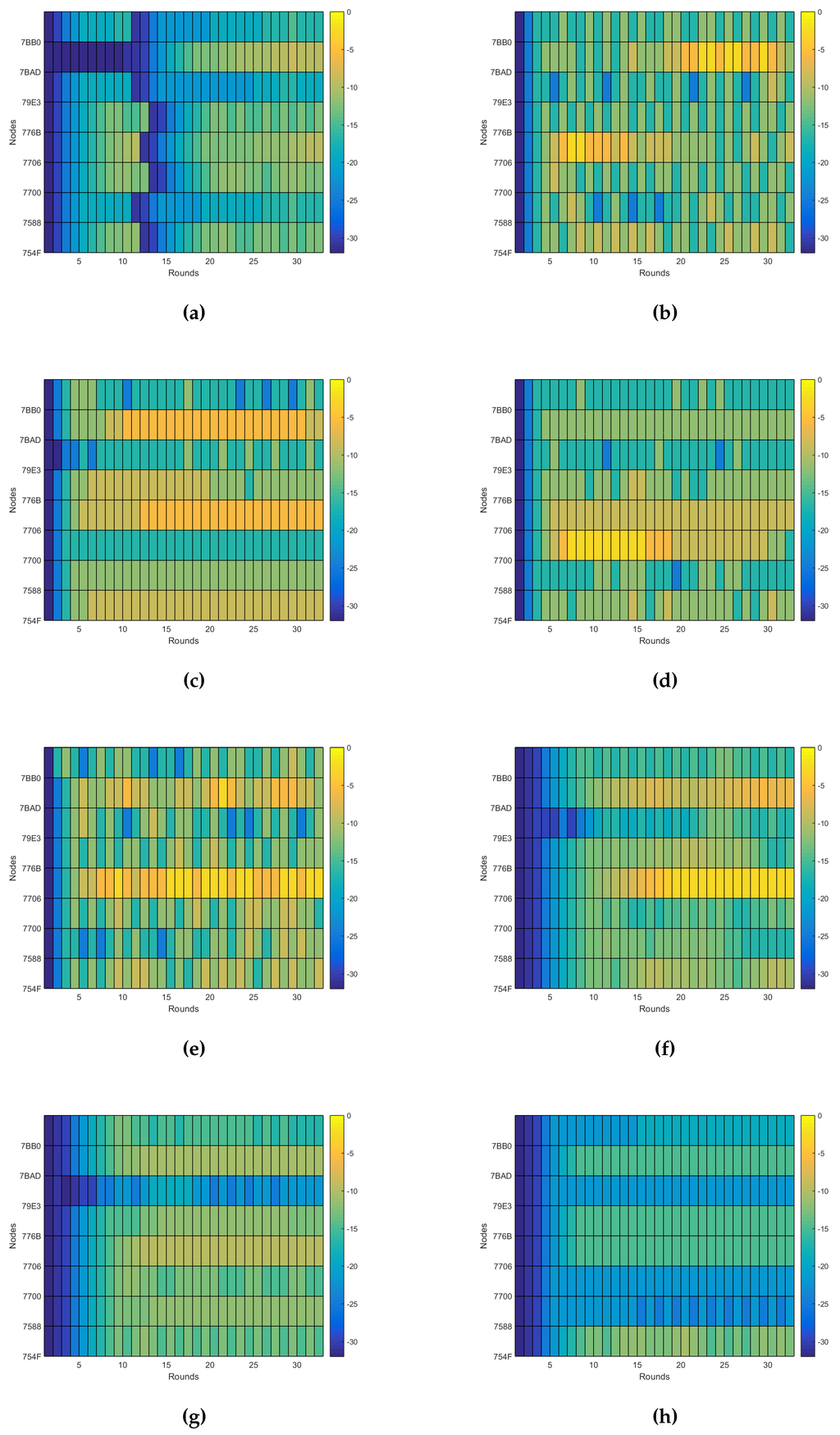 - Kusy, B.; Richter, C.; Hu, W.; Afanasyev, M.; Jurdak, R.; Brunig, M.; Abbott, D.; Huynh, C.; Ostry, D. Radio diversity for reliable communication in WSNs. In Proceedings of the 2011 10th International Conference on Information Processing in Sensor Networks (IPSN), Chicago, IL, USA, 12–14 April 2011; pp. 270–281.