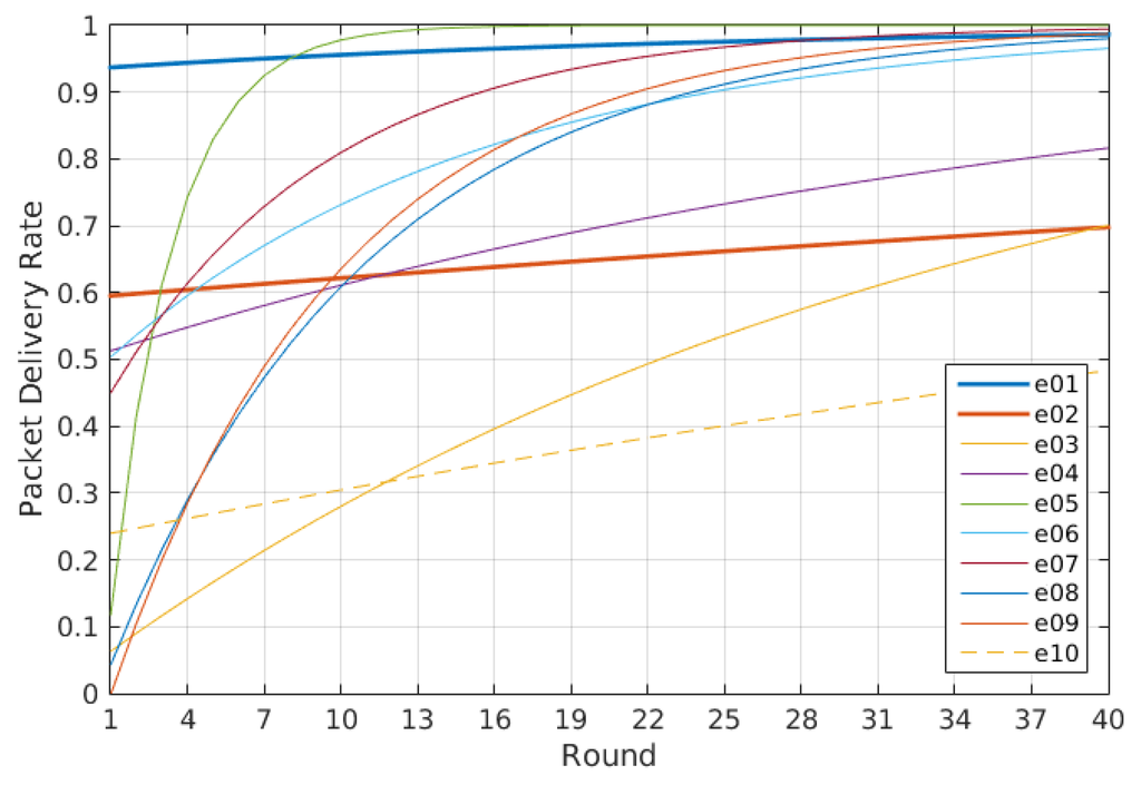 As Figure 14 shows, the minimum network energy consumption corresponds to Experiment e01, while the maximum corresponds to Experiment e02. In both cases, the transmission power was set to a fixed value. The first was set to a medium one, and the second to the maximum available one. In Figure 15, we can compare also the results for the connectivity as an expression of the tendency curves for the packet delivery ratio (PDR) for the whole network as presented in [10]. In this case, the situation is reversed: the maximum transmission power, as expected, provides a 99% PDR, while the medium transmission power merely reaches 70% PDR.