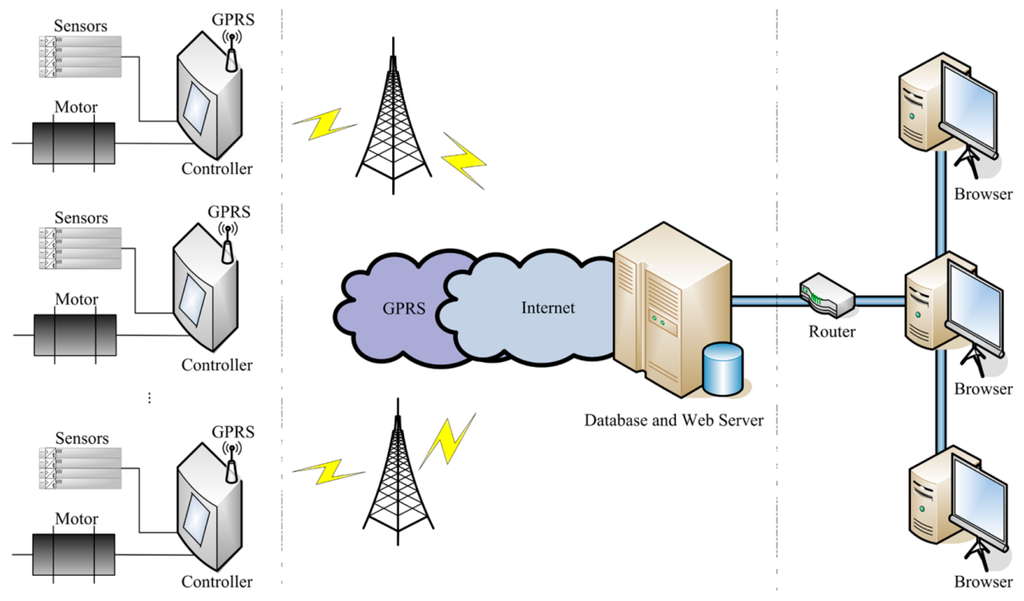 - Data exchange with the server. The network connectivity is essential for a practical application of IoT technology in energy savings of a beam pumping unit. Considering the poor network conditions in an oilfield and the cost of long-range wireless communication, a GPRS module was chosen to implement the real-time data exchange with the server online, instead of a 3G module or even the Internet.