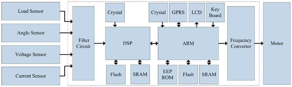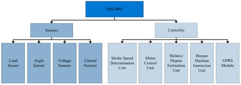 The main hardware components of ESS-BPU are presented in Figure 2. It can be seen that the energy saving device in the oilfield is primarily comprised of four types of sensors and a controller. These sensors include load sensor, angle sensor, voltage sensor, and current sensor. The controller is the center for calculation and control of this energy saving system, which mainly contains a stroke speed determination unit, motor control unit, balance degree estimation unit, human machine interaction unit, and GPRS module.