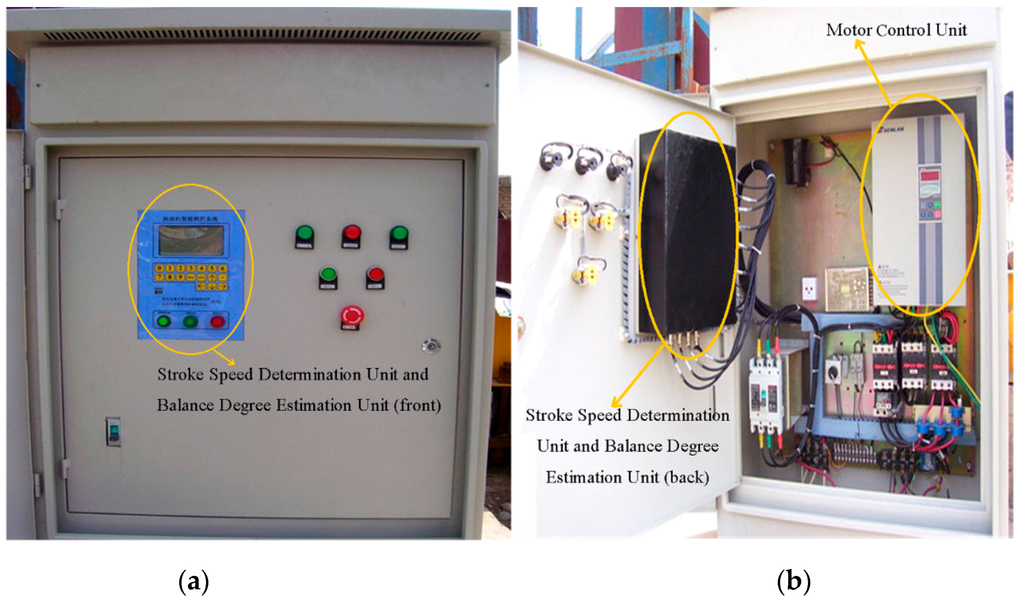 The controller in the oilfield is the core hardware component of the ESS-BPU, which can fulfill the tasks of sensor data receiving, stroke speed adjustment, balance degree estimation, human machine interaction, and data exchange with the sever. Its functional block diagram and physical appearance can be found in Figure 3 and Figure 4, respectively. The following are the main functions and features of this controller:
