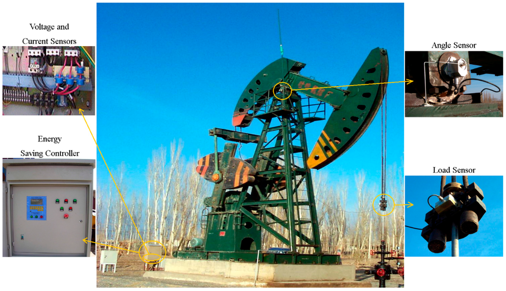 ESS-BPUs have been installed and applied in a number of oilfields located in the northwest of China, such as the Huachi oilfield in Gansu province, the Tuha oilfield in Xinjiang province, and the Wuqi oilfield in Shaanxi province. A beam pumping unit and the energy-saving device installed on it are shown in Figure 5. Some important details are magnified, including the actual assembled positions for the four types of sensors and the controller. It can be seen that the load sensor was embedded in the carrier bar of the pumping unit, the angle sensor was fixed at one end of the central rotating shaft of the walking beam, the voltage and current sensors were mounted at the output power lines of the frequency converter, and the controller was employed to replace the original control cabinet for the pumping unit. The sensors measured the operating state of the pumping unit automatically and converted it into analog signals in real-time. The controller received the configuration information entered by the installer, and implemented the tasks of analog signal digitization, calculation, control, and communication with the server online.
