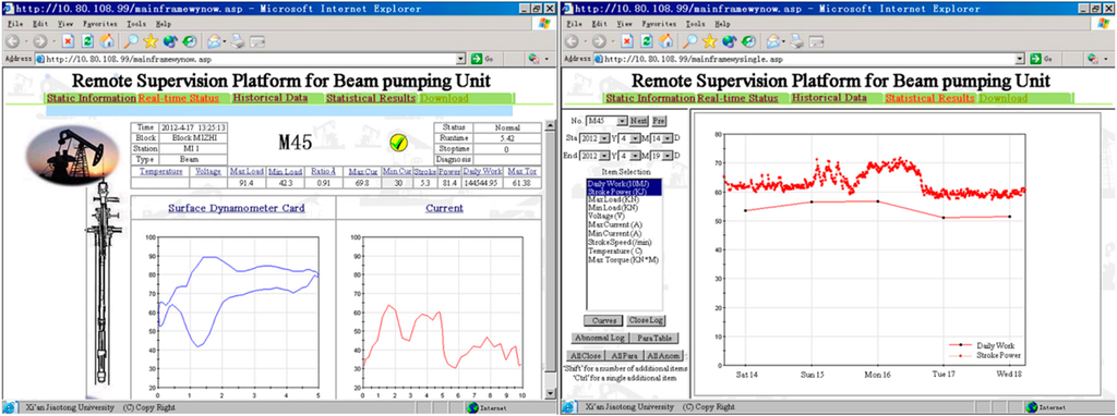 The remote supervision platform is designed for online monitoring of operating states and timely responses to abnormal situations. Firstly, the pumping unit is often located in an inaccessible area and has a relatively dispersed geographical distribution, this centralized monitoring platform can greatly reduce the frequency of manual inspections over a long distance. More importantly, the information on this platform is conductive to the judgment of abnormal situations and helpful to recovery of the energy-saving efficiency of the device. The real-time, historical, and statistical data hosted in the database server can be accessed through a terminal browser in some kind of meaningful form, which allows clients to make a comprehensive analysis remotely. Thus, it is convenient to identify, or even predict, which kind of abnormal condition the pumping unit is or will be under so that a timely response can be made and the energy-saving efficiency of this device could be recovered as soon as possible.