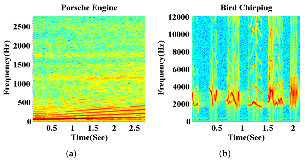 Spectrogram of (a) a Porsche engine and (b) a bird chirping.