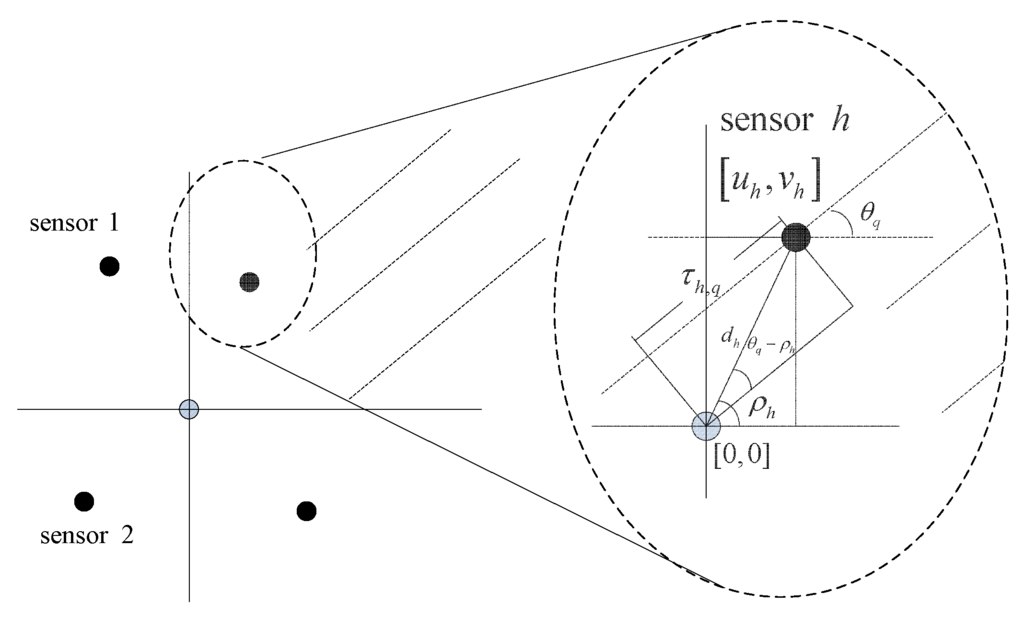 Figure 2 is the time delay model of a sensor array. Define as the incident angle of the q-th source, c as the speed of acoustic signal and as the position of the h-th sensor with respect to the array centroid (). The time delay is given by: