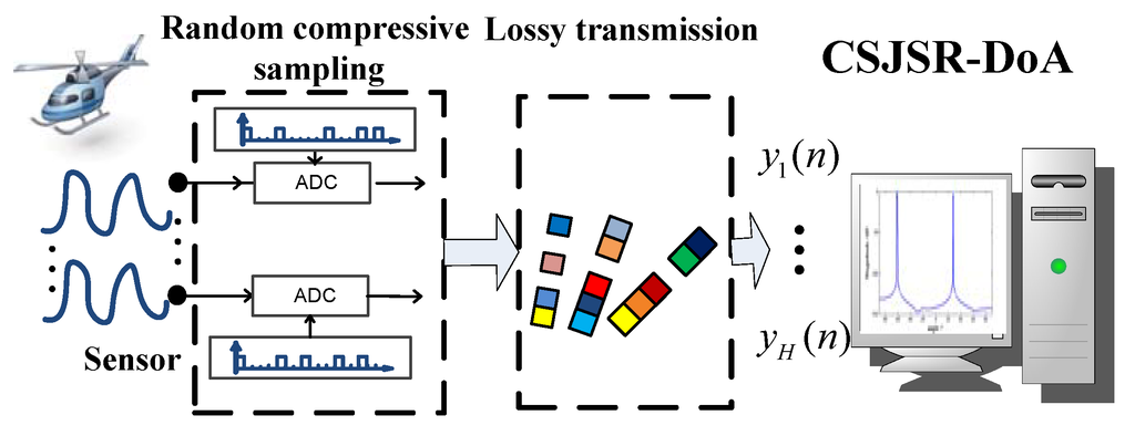 Direction of arrival (DoA) estimation using acoustic sensor arrays has attracted significant interest due to its wide applications [1,2,3,4]. Traditionally, DoA is realized using sensor arrays, such as passive towed-array sonar systems, where all sensors are wire-connected to a fusion center (FC) [5]. For wireless sensor array networks (WSAN) [6,7], arrays (locally wire/wireless-connected clusters) of dispersed sensors are deployed over large sensor fields and communicate wirelessly to the FC. However, remote sensor arrays often suffer from restricted resources, such as local power supply, local computational capacity and wireless transmission bandwidth. Therefore, data samples at remote sensor arrays need to be compressed before transmitting to the FC. On the other hand, executing sophisticated data compression algorithms on remote sensors is also restricted by local power consumption and computational ability.