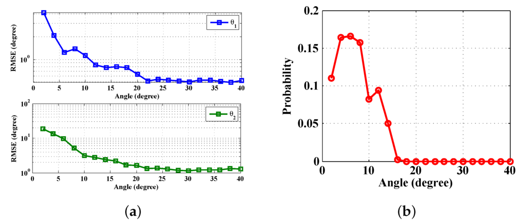 Angle separation comparison: (a) RMSE versus angle (b) false probability versus angle.